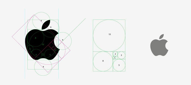 從上述的例圖中,拿蘋果的logo來分析,在蘋果logo輔助線分解中,我們可以看出蘋果logo的設計正是采用半徑1,1,2,3,5,8,13的圓切割而成,也就是上述我們說的斐波那契數(shù)列。